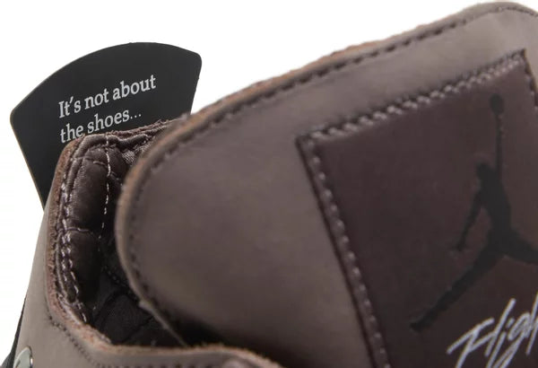 Woven Flight tongue tags present a unique blend of mismatched branding, featuring both the classic Jumpman logo and A Ma Maniére’s signature, underscoring the collaboration’s distinct identity. The molded black heel tabs are adorned with a raised Nike Air logo, and on the interior side of each heel tab, you'll find the inspirational phrase, 'It’s not about the shoes … it’s about where you’re going,' highlighting the deeper meaning behind the design.