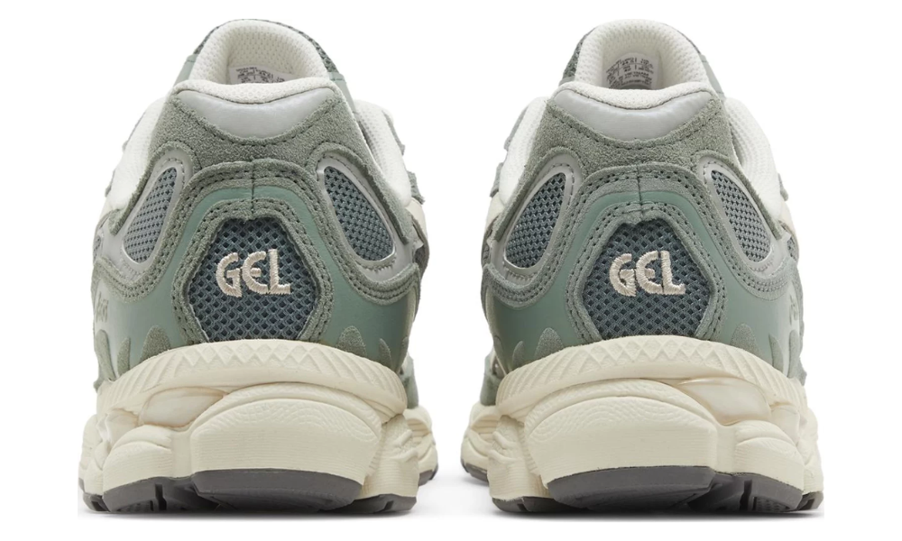 This iteration of the ASICS Gel-NYC is made with a dark gray mesh base for breathability. This material forms the toe box and is revealed under the overlays across the midsole and heel. Ivy green and gray suede overlays adorn the shoe. Ivy suede forms the toe cap and mudguard, snaking around and up the heel, while gray overlays connect the toe cap to the laces and run underneath the ASICS logo on the sides. The ASICS design appears on each side in white. The word GEL appears on the heel, and the ASICS brand name appears on the lateral heel on the green overlay. The tongue is also branded. An off-white textured outsole features Gel technology for support and cushioning.