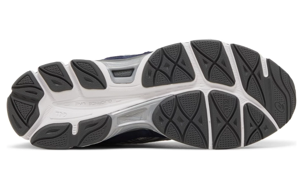 The ASICS Gel NYC 'Navy Steel' is built with a breathable white mesh upper, featuring grey tiger stripes and synthetic leather overlays in metallic silver. Navy suede construction appears on the eyestay and mudguard. A two-tone EVA foam midsole in white and grey packs visible Gel cushioning in the forefoot and heel. Underfoot, a podded rubber outsole delivers durable traction with flex.