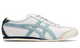 This version of the Onitsuka Tiger Mexico 66 is made with a white leather upper. Beige suede overlays adorn the toe cap and form an X at the heel. Burgundy tiger stripes that have become synonymous with the brand run across the midsoles. The Onitsuka Tiger logo appears on the thin white tongue in burgundy and the word 'Tiger' on the leather white heel tab, also in burgundy. A thin, flat, rubber outsole completes the streamlined look.