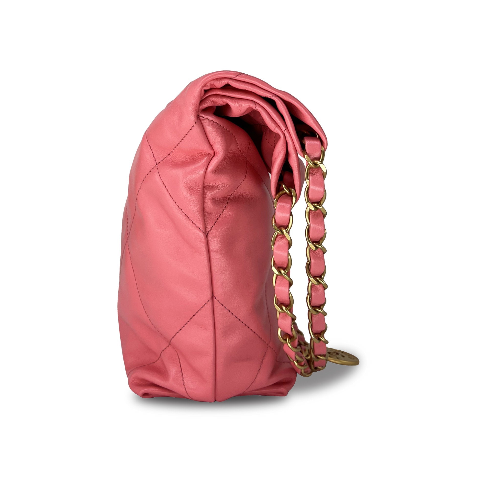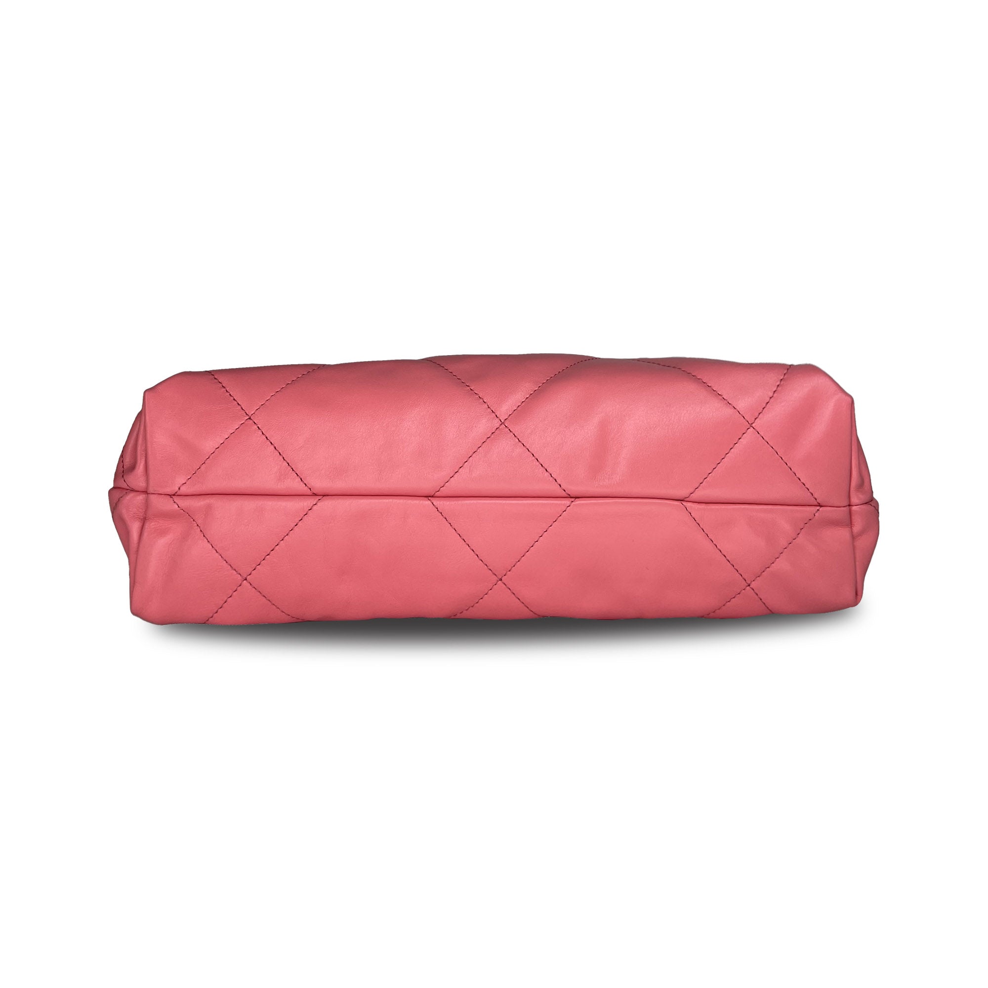 Chanel 22 Handbag loses with a magnetic button and purse-like drawstrings. Features an inside zipped pocket and a removable pouch.