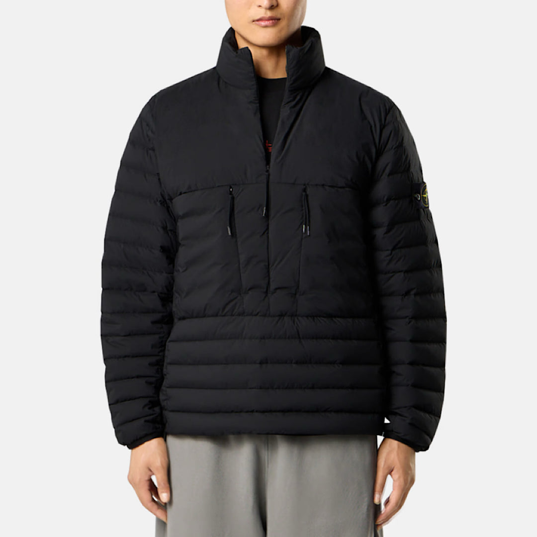 Piumino anorak in un tessuto leggero di nylon a uno strato stretch con canali senza cuciture per una migliore tenuta delle piume, colletto imbottito e tasche con zip invisibili. Modello tinto in capo con antigoccia.
