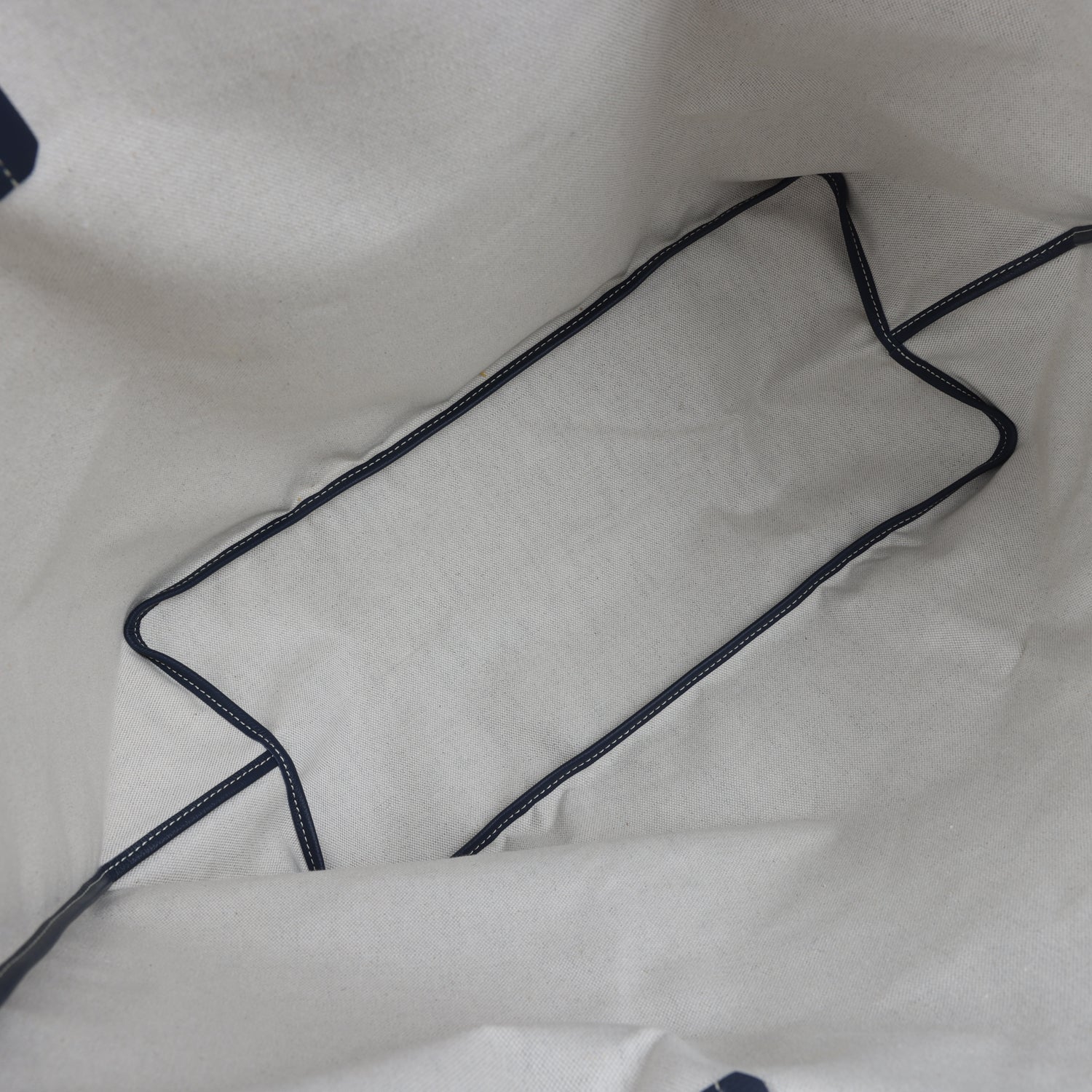This St. Louis GM tote is in Navy Goyardine canvas with palladium hardware and features blue leather handles and trim, removable pouch and contrast stitching.