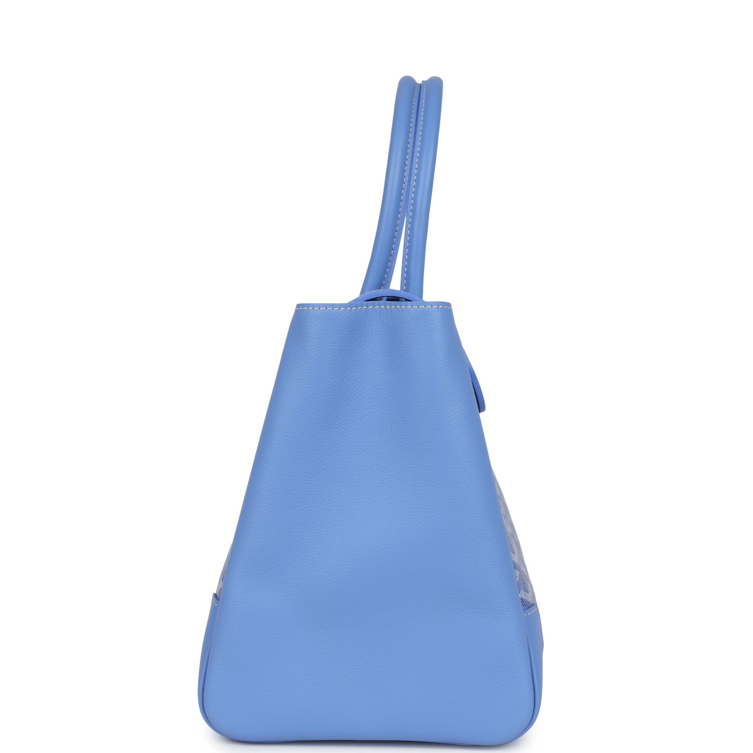 This soft Saigon Tote is in iris Goyardine coated canvas and Chevroches calfskin with palladium hardware, contrast stitching, features two double rolled top handles, signature saigon leather strap and loop closure, a cutout in the top of the flap for the handle to fit through.