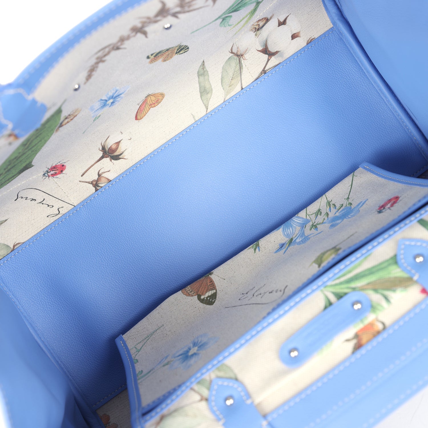The Interior is lined is floral canvas and iris chevroches calfskin, single floating pocket and a wooden detail on back of bag with palladium studs.