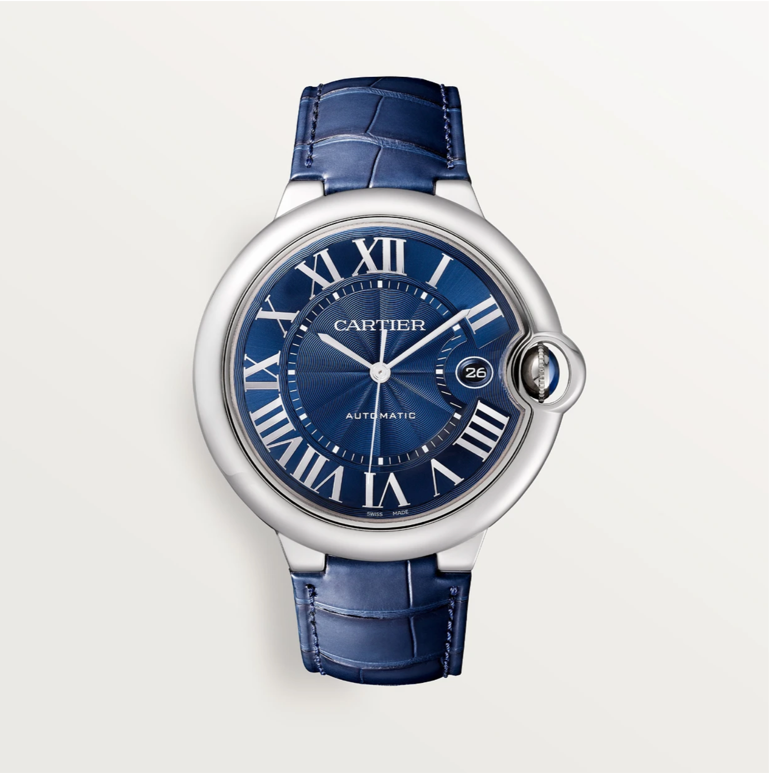 | The Ballon Bleu de Cartier watch offers ultimate elegance with its blue guilloché dial, alligator-skin strap, and fluted crown set with a synthetic cabochon-shaped spinel. | |
