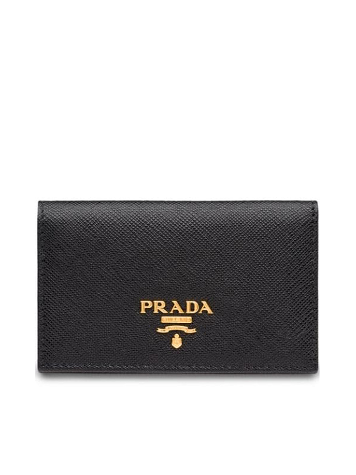 Portacarte di Prada. Modello con placca con logo color oro e chiusura con bottone automatico.