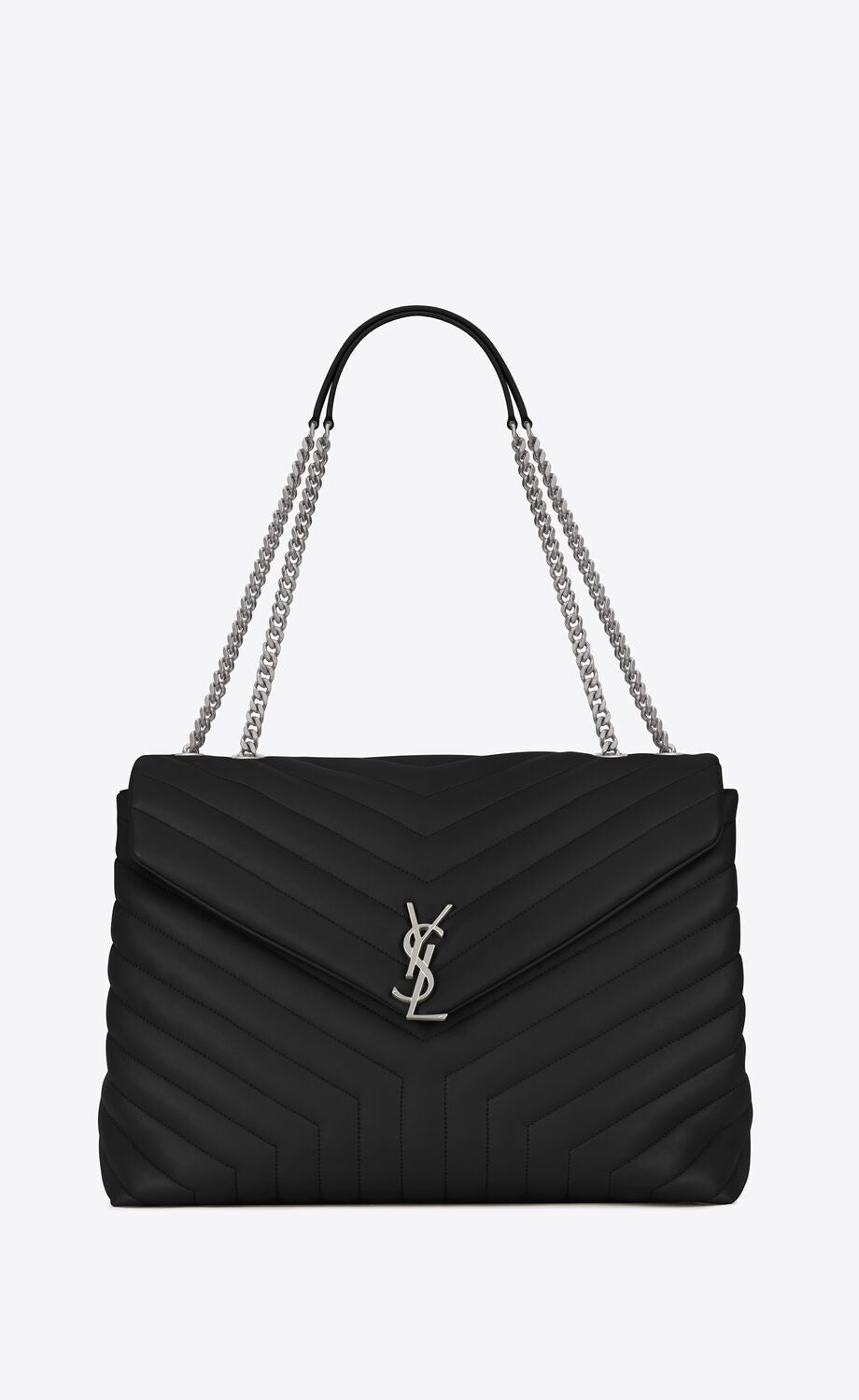 - Front-flap structured bag with intertwined metal YSL initials, leather and chain shoulder strap, and quilted 'Y' stitching.