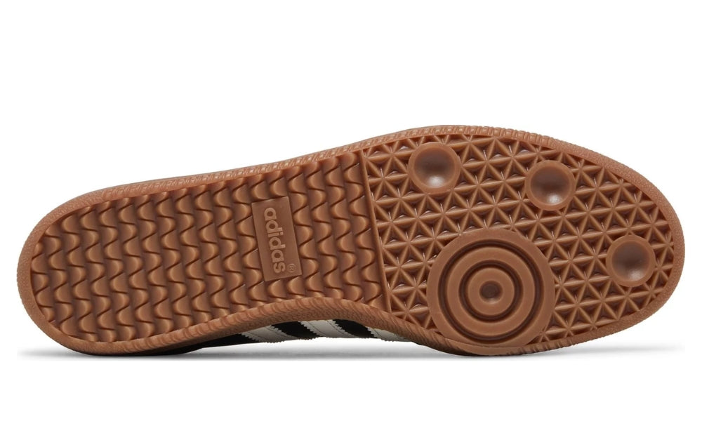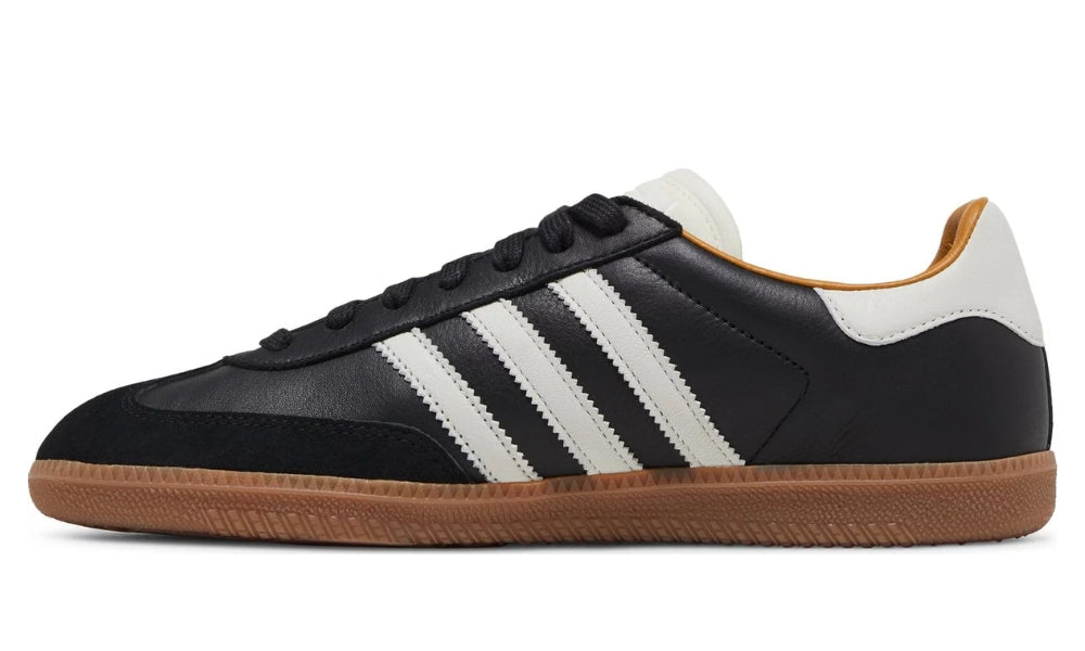 The JJJJound x adidas Samba OG 'Black' updates the classic silhouette with a premium build. Made in adidas' Scheinfeld factory in Germany, the low-top features a black leather upper with a tonal suede T-toe overlay. White leather accents settle on the signature three-stripes and back tab. 'JJJJOUND' is stamped in gold foil lettering on the lateral quarter panel, while dual branding appears on the tan leather collar lining. The sneaker is mounted on a low-profile gum rubber sole unit.