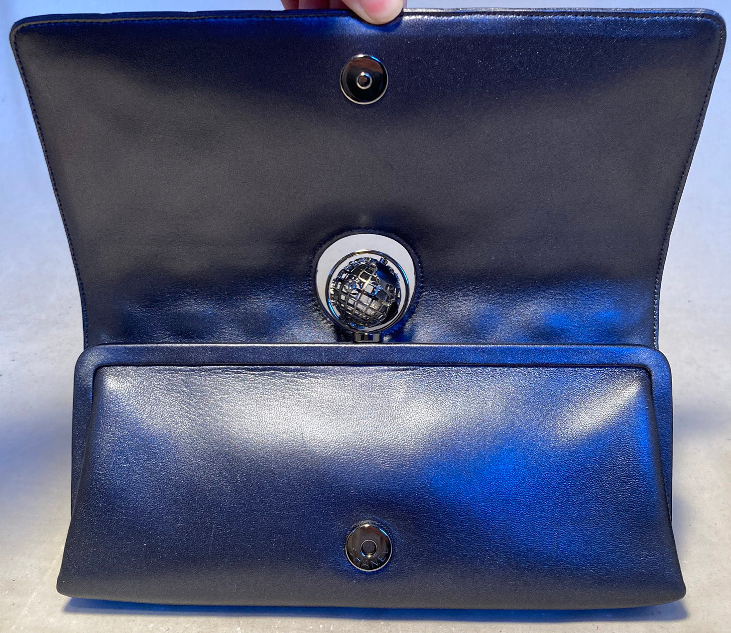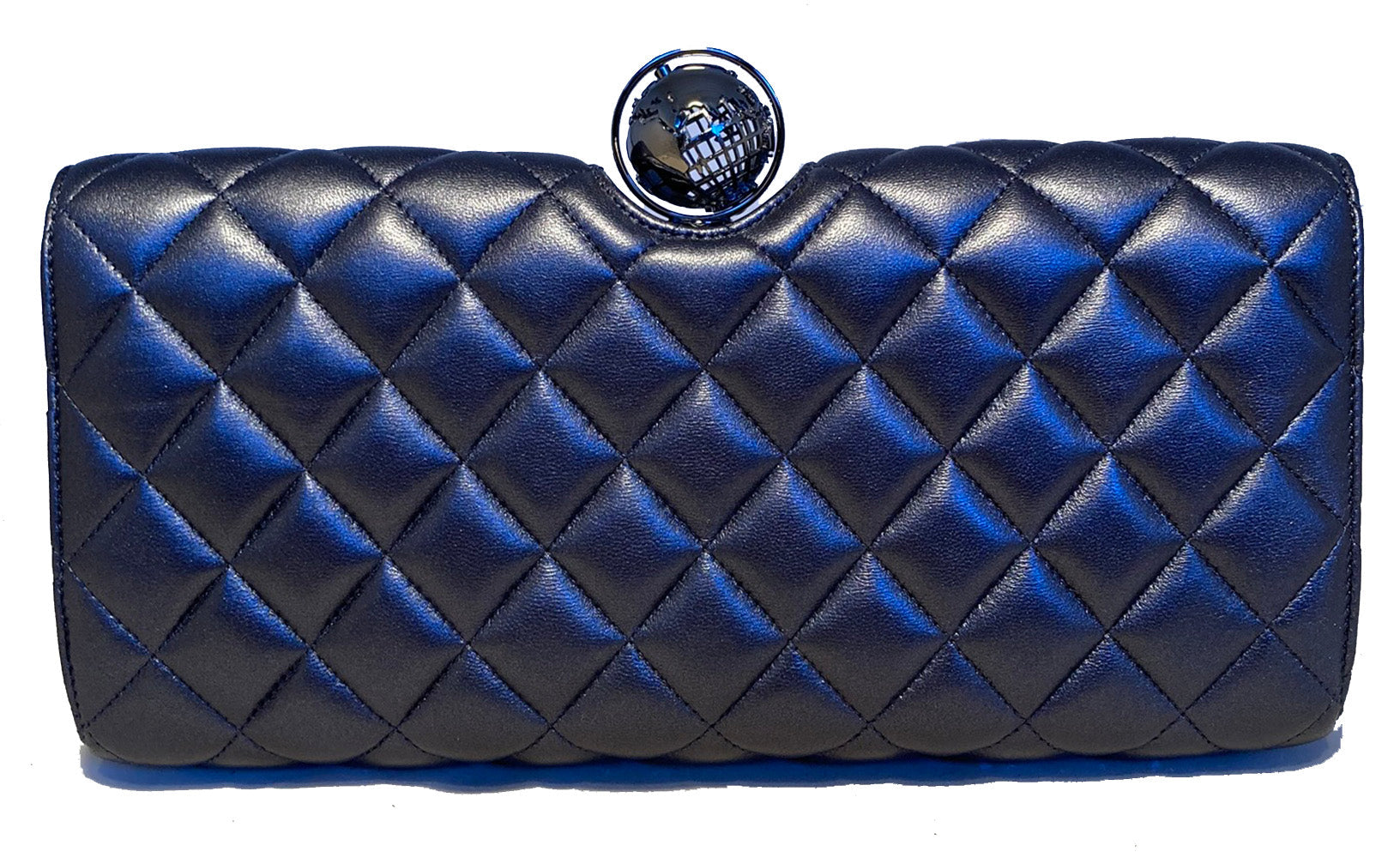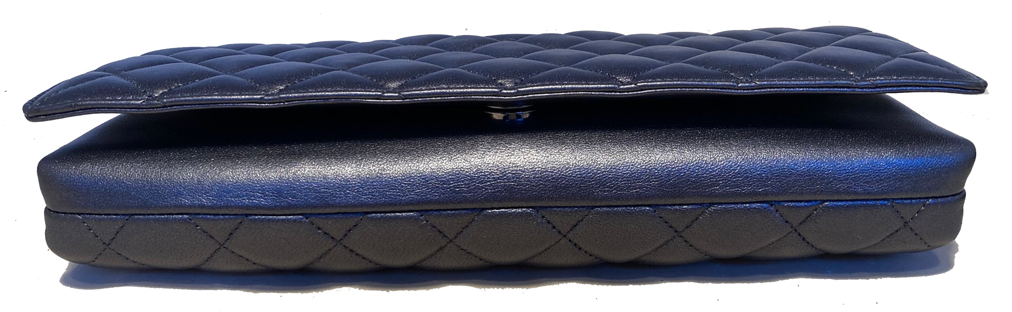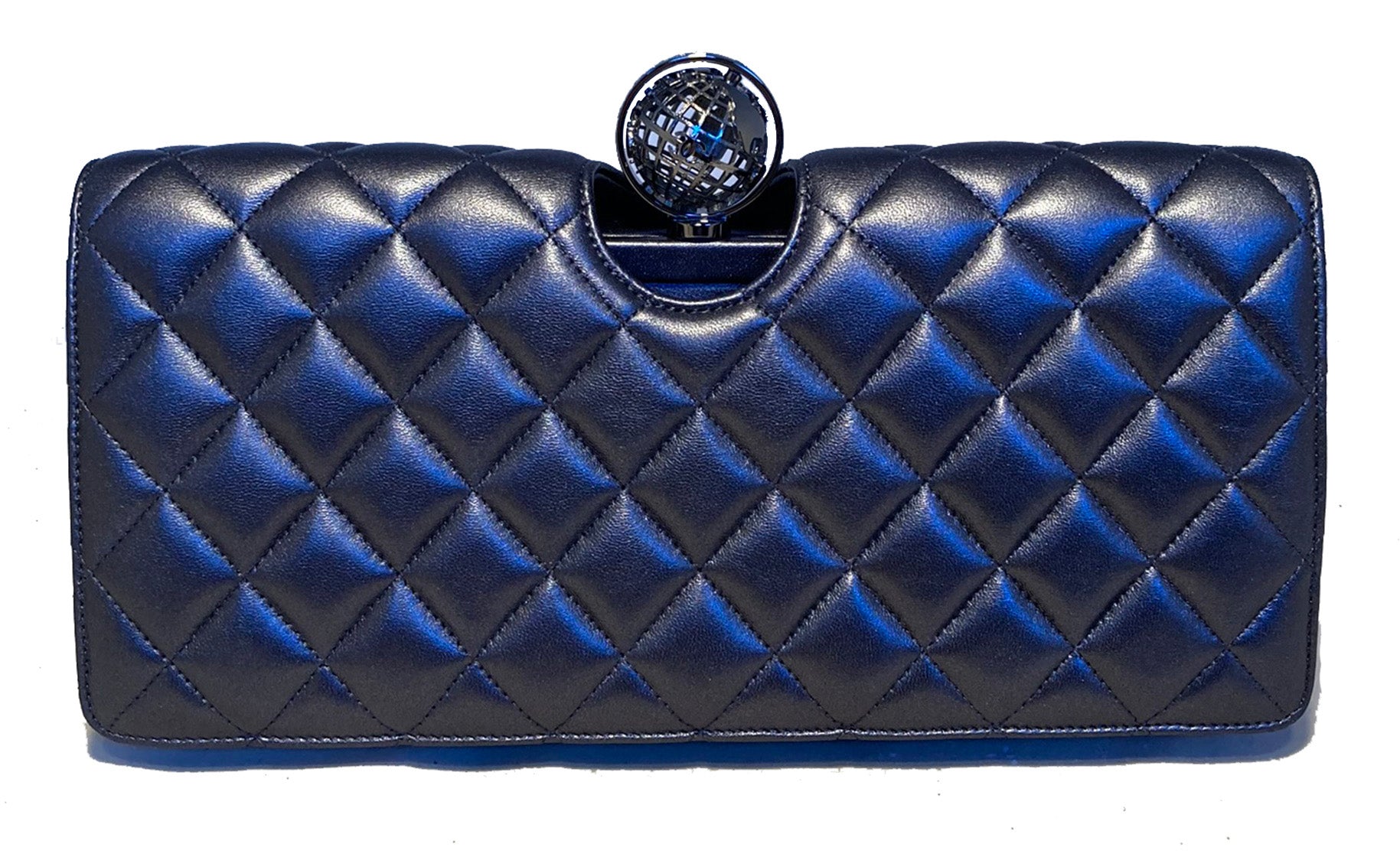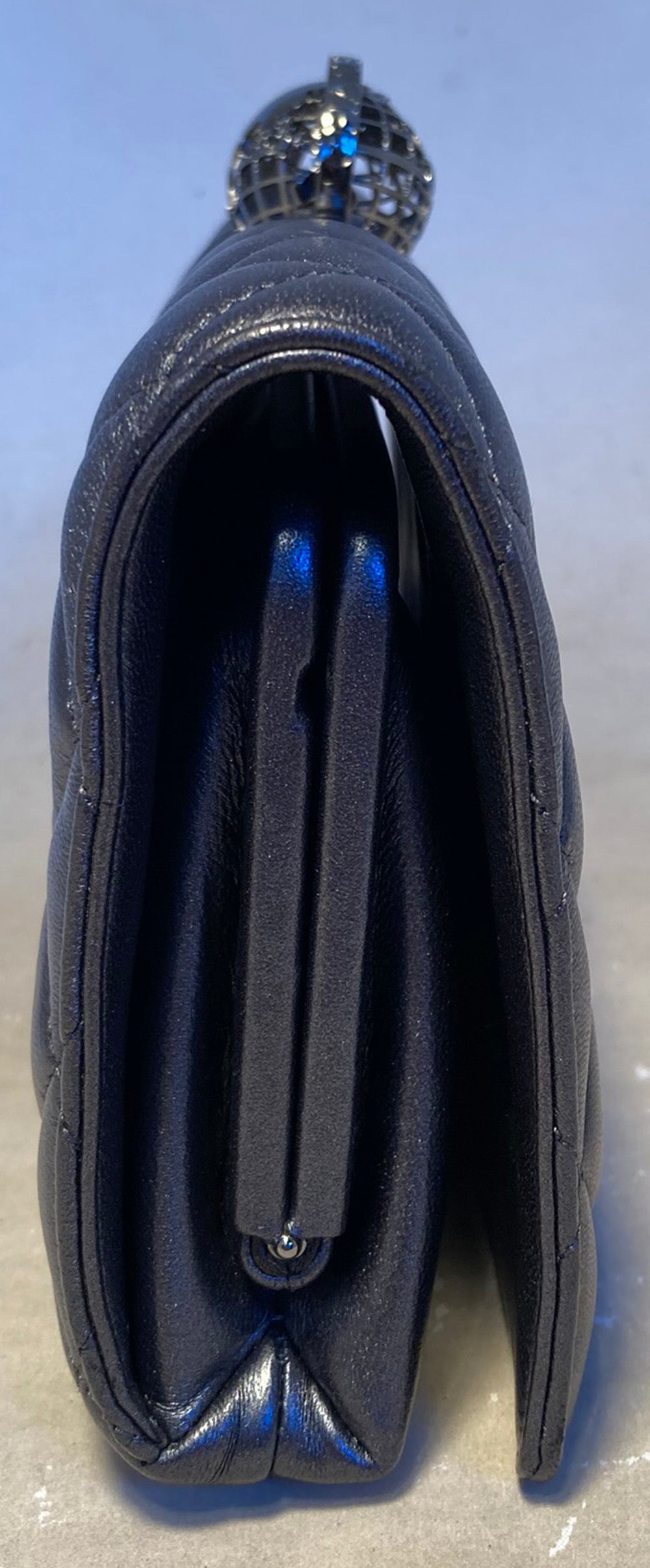 Chanel Around the World Classic Flap in excellent condition. Slate gray quilted lambskin exterior trimmed with a gunmetal spinning globe top. Single flap opens to a hinged closure revealing a dark gray satin interior with one small slit card pocket and attached woven chain and leather shoulder strap. Easily converts between clutch and shoulder styles. No stains, smells or scuffs. Clean corners, edges and interior. Purchase includes a dust cover and identity card. Rare find from the 2013 fall/winter runway collection. Measurements: 10'x4.75'x2' 20' strap drop