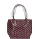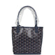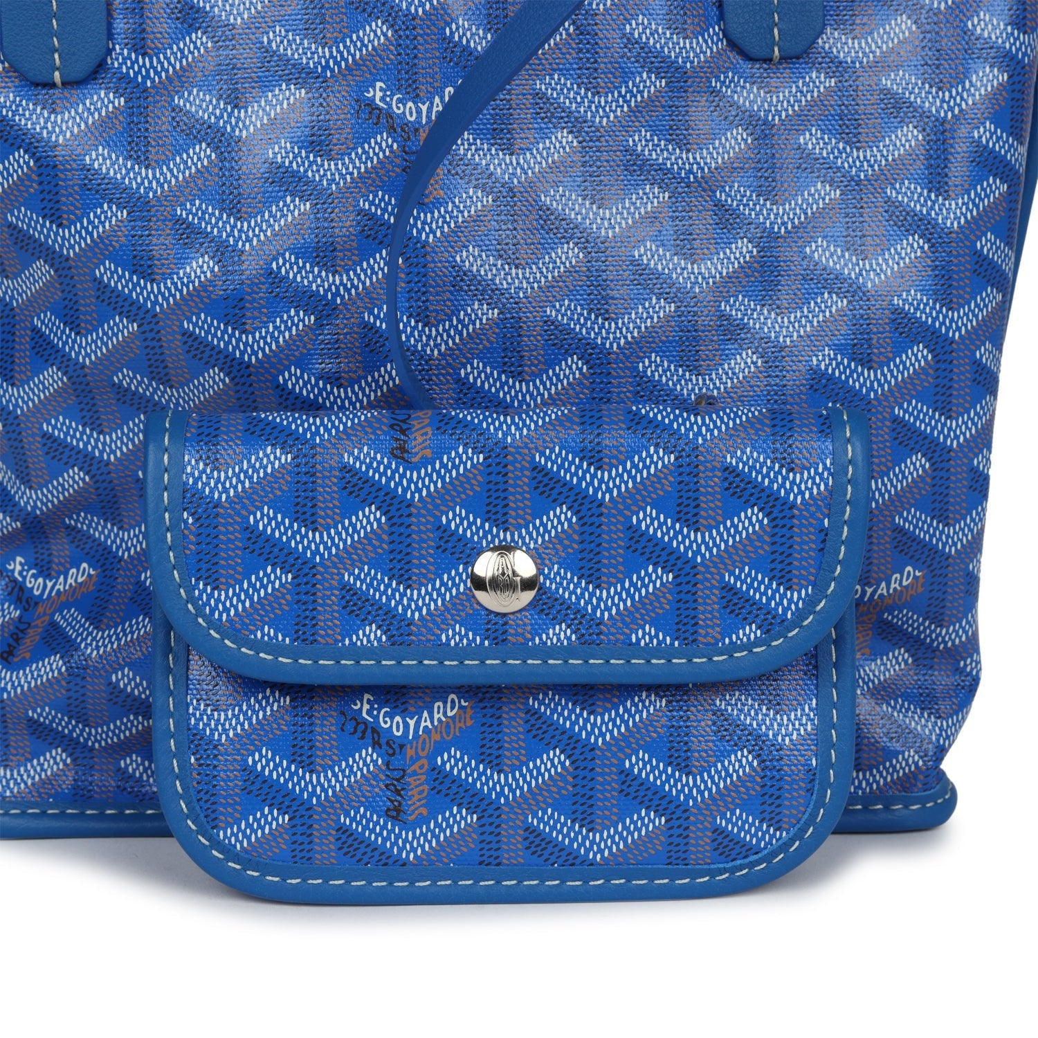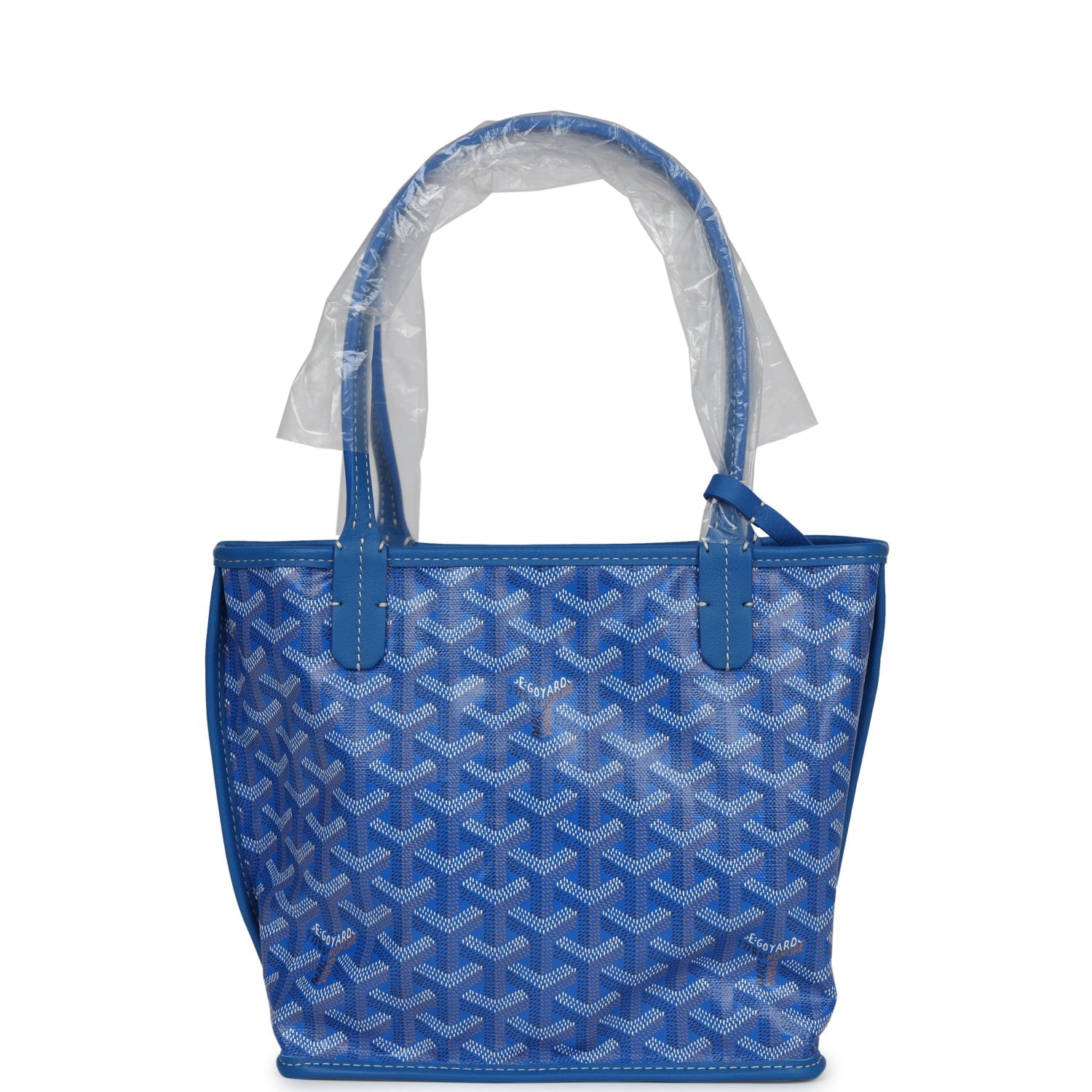 This Anjou Mini reversible tote is of sky blue Goyardine canvas and leather with palladium hardware and features sky blue leather handles and trim, removable pouch and contrast white stitching.