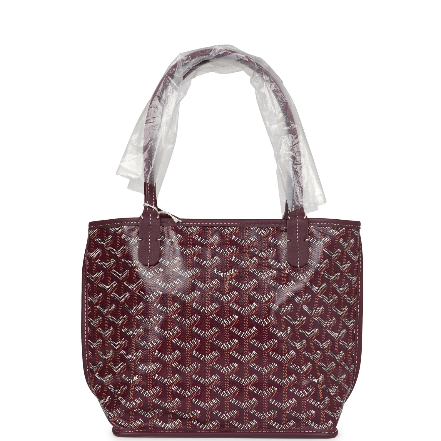This Anjou mini reversible tote is in burgundy goyardine canvas and leather with palladium hardware and features contrast stitching, burgundy leather handles and trim, and a detachable yellow pouch.