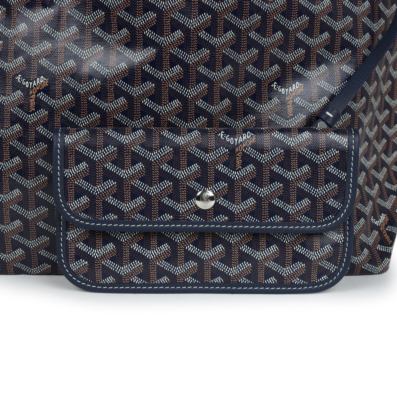 This St. Louis PM tote is in navy Goyardine canvas with palladium hardware and features blue leather handles and trim, removable pouch and contrast stitching.