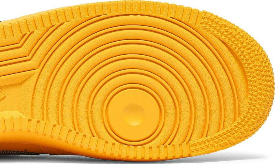 The Nike Air Force 1 OFF-WHITE University Gold Metallic Silver features a University Gold leather upper with Metallic Silver Swooshes and orange tab detailing. From there, foam construction is exposed at the ankle and tongue, continuing Abloh's themes of deconstruction. Signature “AIR” text on the sole and a monochromatic zip-tie wrapped around the laces completes the design.