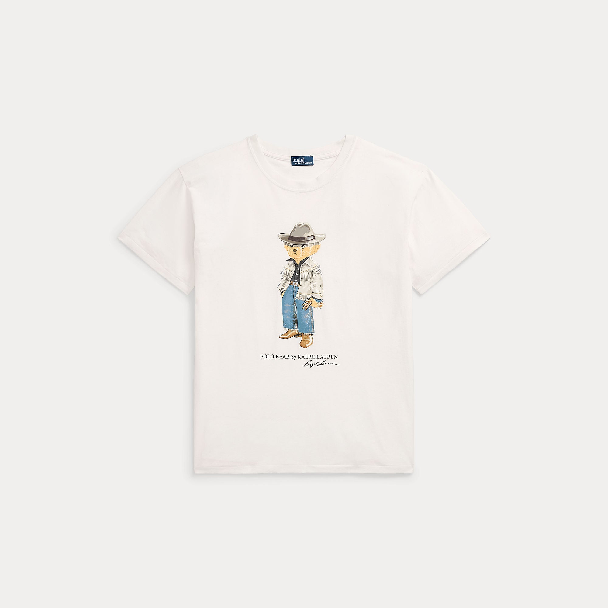 This cotton jersey crewneck tee features Ralph Lauren's Polo Bear donning a Westernwear-inspired outfit with embroidered details.