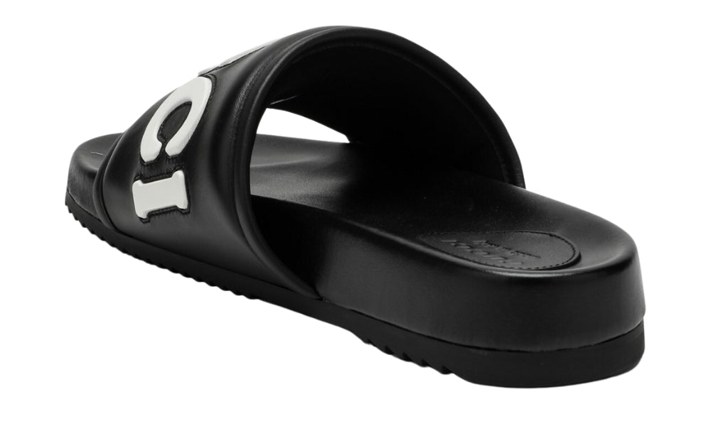 Slide by Gucci in black leather, characterized by a rounded toe, upper with logo and rubber sole.