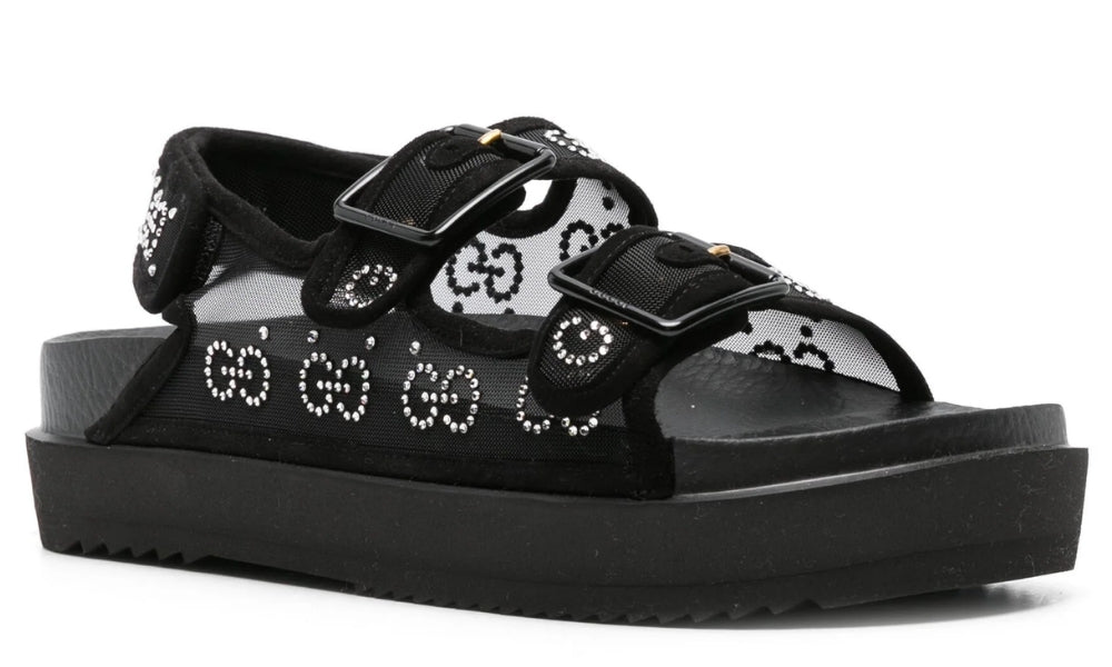 Taken from the house's '70s archives, the GG monogram; Guccio Gucci's initials, are a key feature of the brand's designs. Featured as an all-over pattern on this pair of sandals, the design is given an opulent twist through their crystal-embellished finish.