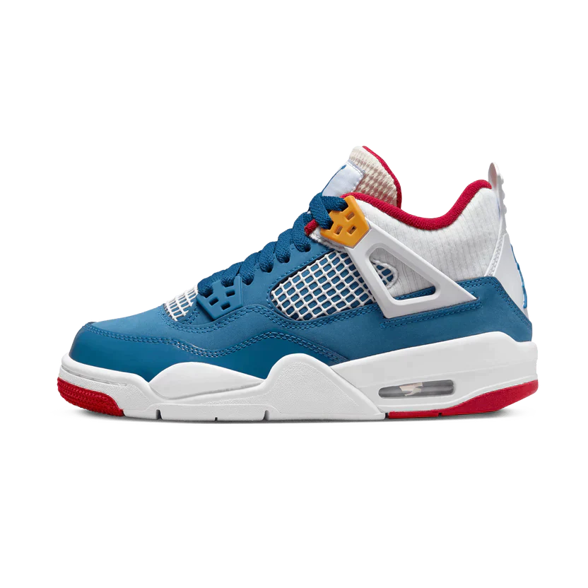 The Air Jordan 4 Retro GS ‘Messy Room’ appears with the standard color blocking of blue, white, red and yellow. But a close-up of the panels shows a wild mix of textures and materials to represent messy kids’ bedrooms. Of course, standard Jordan 4 elements remain like mesh on the sides, supportive lace wings, Jumpman-branded tongues and heel tabs. Multi-colored Air Jordan branding is hidden behind the tongue and a classic Air sole underfoot completes this Jordan 4.