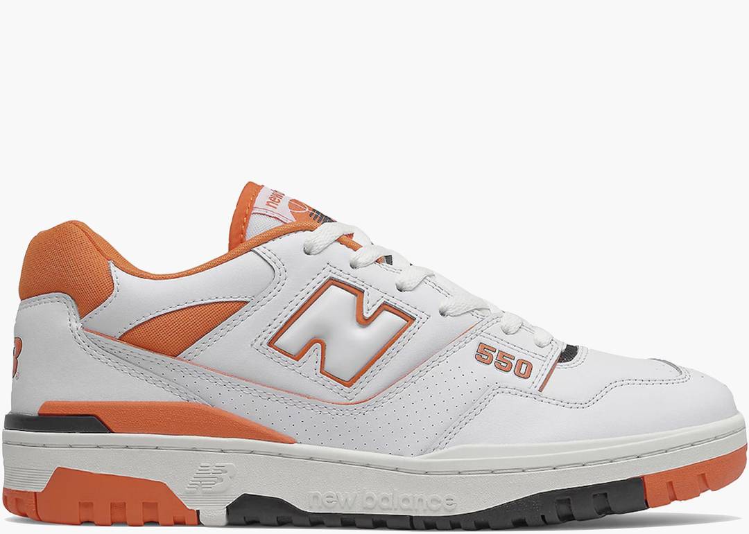 This New Balance 550 Syracuse features a white leather base with orange contrasting accents. A white smooth leather 'N' logo on the sides atop a black/orange rubber outsole completes the design of this sneaker.