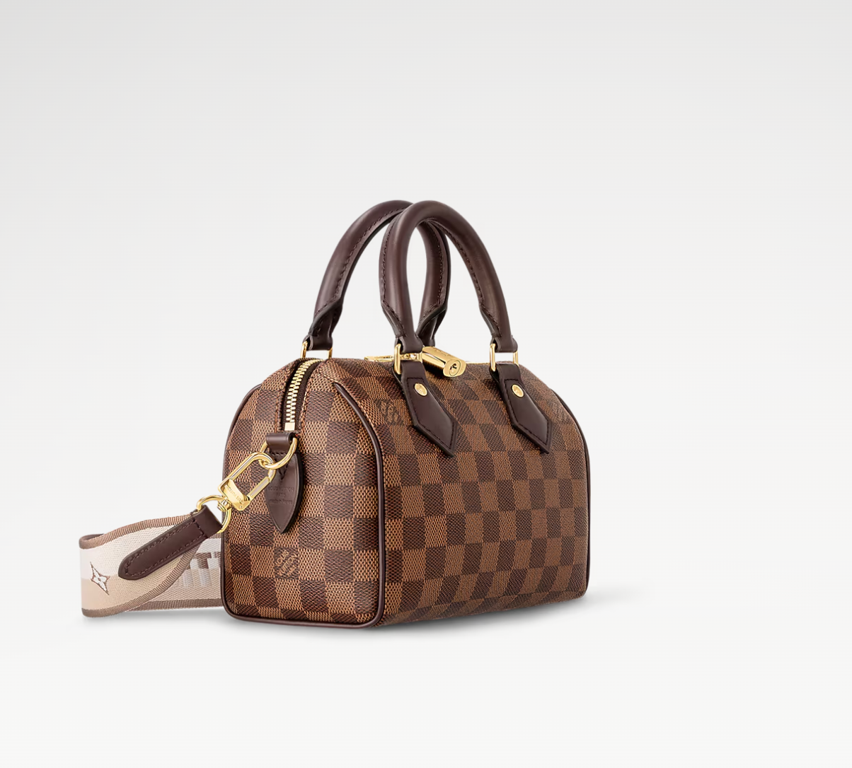 The Speedy Bandoulière 20 city bag is now available in classic Damier Ebene canvas. Finished in chocolate brown leather and featuring a beige fabric strap, this sporty design is designed for active lifestyles. It flatters any body shape with its instantly recognisable shape, engraved gold padlock and iconic rolled Toron handles.