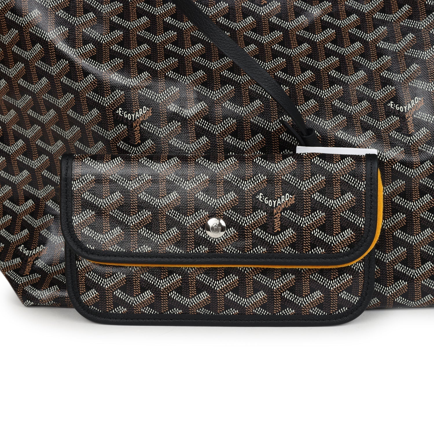 This Goyard Saint Louis PM tote is in black Goyardine coated canvas and black chevroches calfskin leather with palladium hardware, tonal stitching, and has a matching detachable button closure wallet.