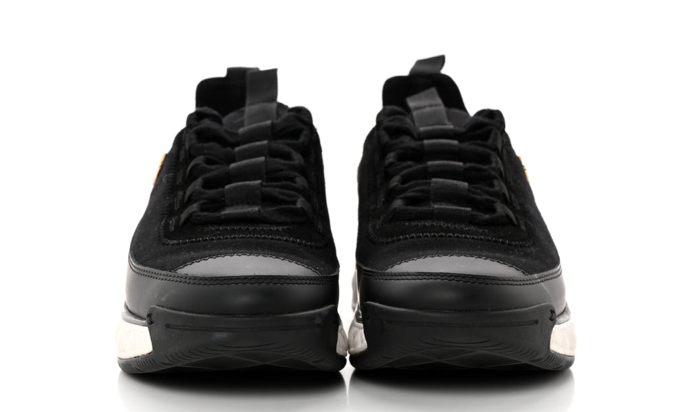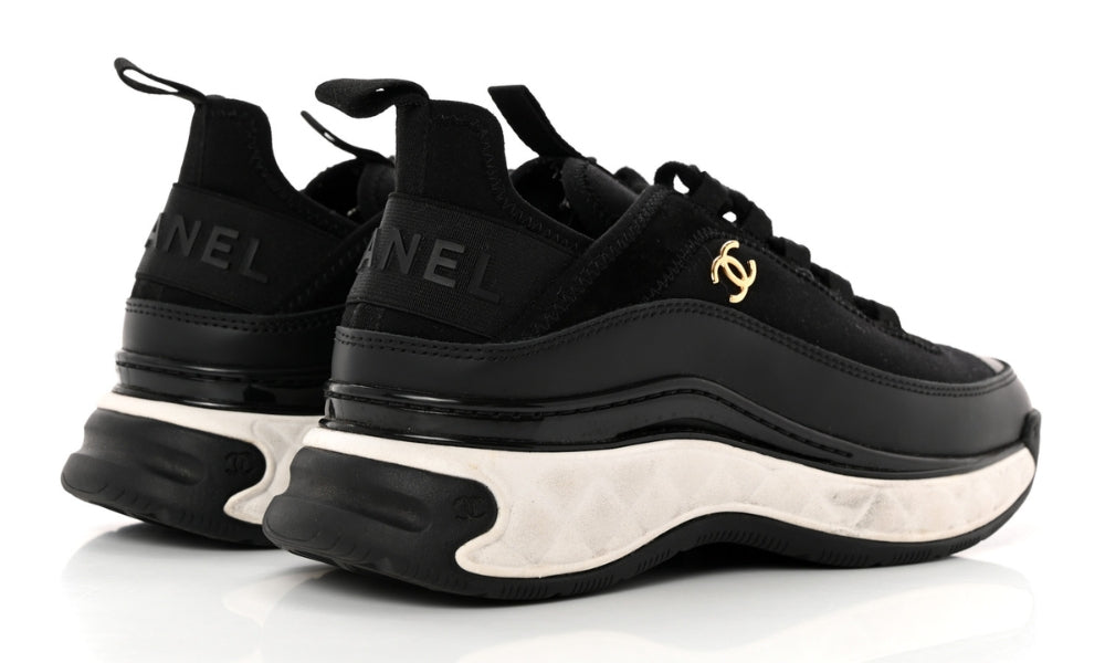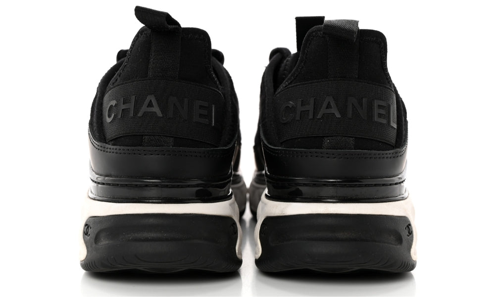 A pair of Chanel Black Calfskin Velvet Mixed Fibres CC Sneakers.