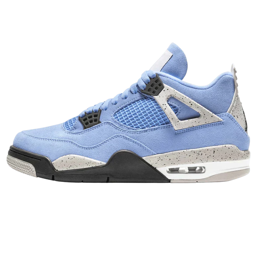 'Air Jordan 4 Retro ''University Blue'' aggiorna la silhouette classica con una tomaia in pelle scamosciata in una tonalità familiare ispirata all'alma mater UNC di Michael Jordan.' La tavolozza blu brillante è contrastata da una finitura grigia maculata sulle ali di supporto e sul tallone posteriore della sneaker, con un'icona Jumpman rialzata in nero. Il marchio Jumpman secondario adorna il tag della lingua intrecciato, progettato per imitare un tag jock che in genere appare sull'orlo inferiore delle maglie Jordan.