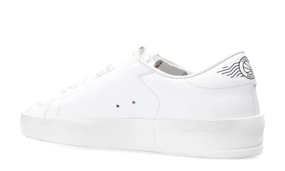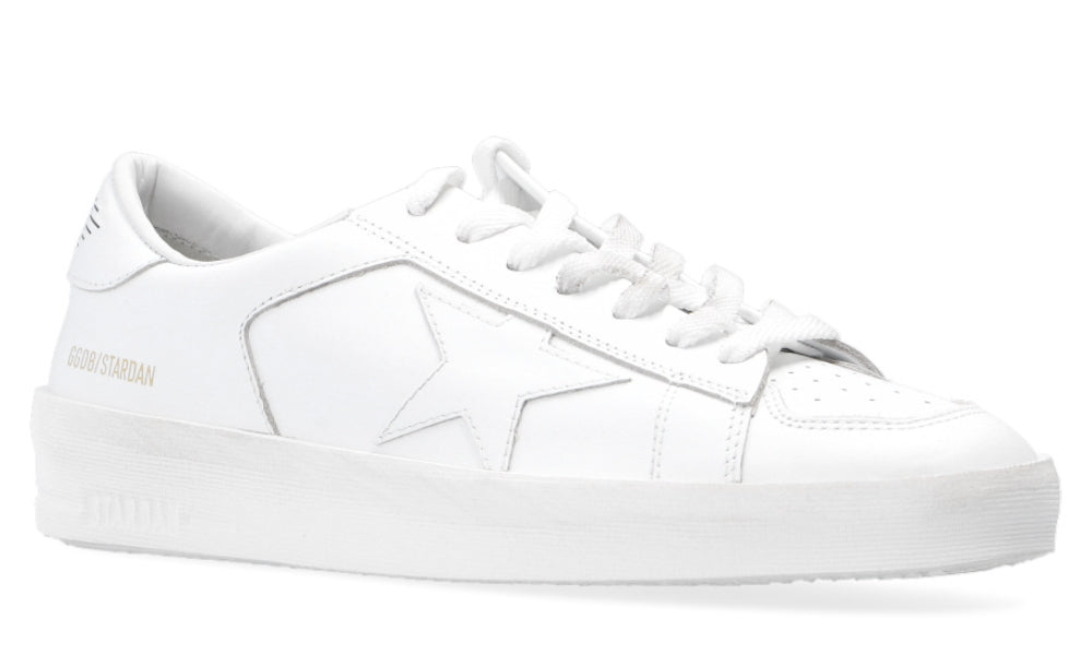 White ‘Stardan’ sneakers from Golden Goose. Made of leather, this lace-up pair features a tongue patch with a logo, perforations and a cream rubber sole.