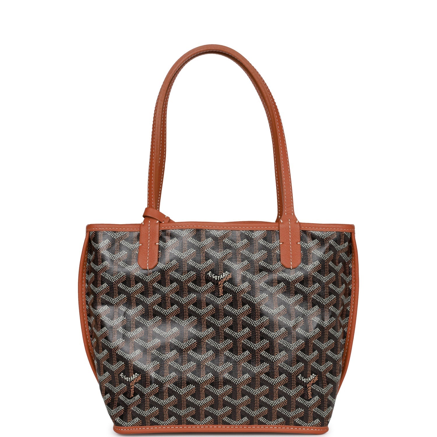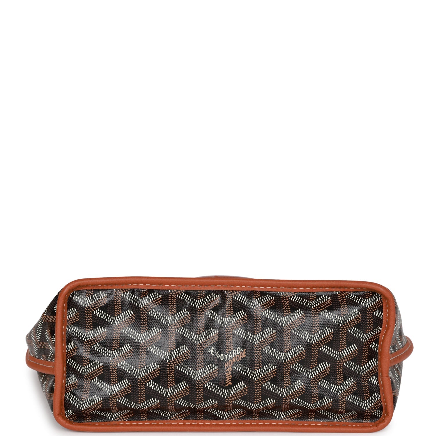This Anjou Mini reversible tote is of Black Goyardine canvas and leather with palladium hardware, contrast stitching, brown chevroches calfskin lining, and a detachable black and brown coin purse
