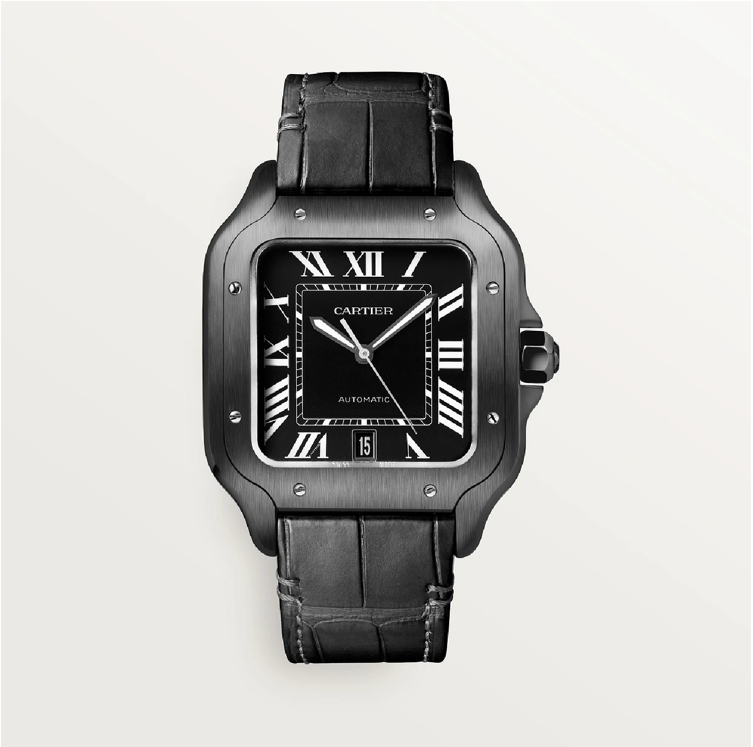 This Santos de Cartier large model features a Swiss automatic caliber 1847 MC, robust black DLC-coated steel case, luminous black hands, and exclusive QuickSwitch strap system. Includes rubber and leather straps for versatile wear.