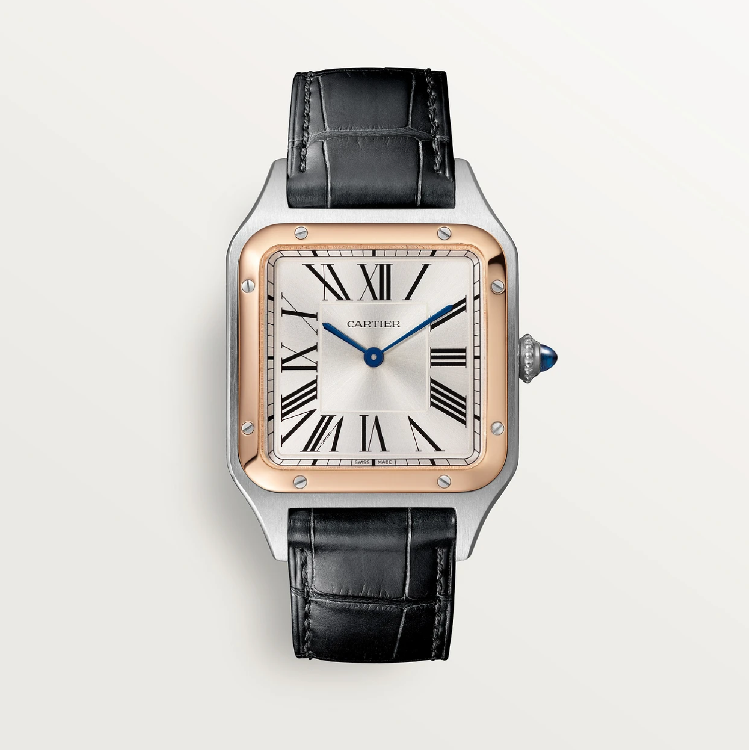 The Santos-Dumont Large model combines Cartier's signature elegance with high autonomy quartz movement and luxurious rose gold details, featuring a silvered dial and classic Roman numerals.
