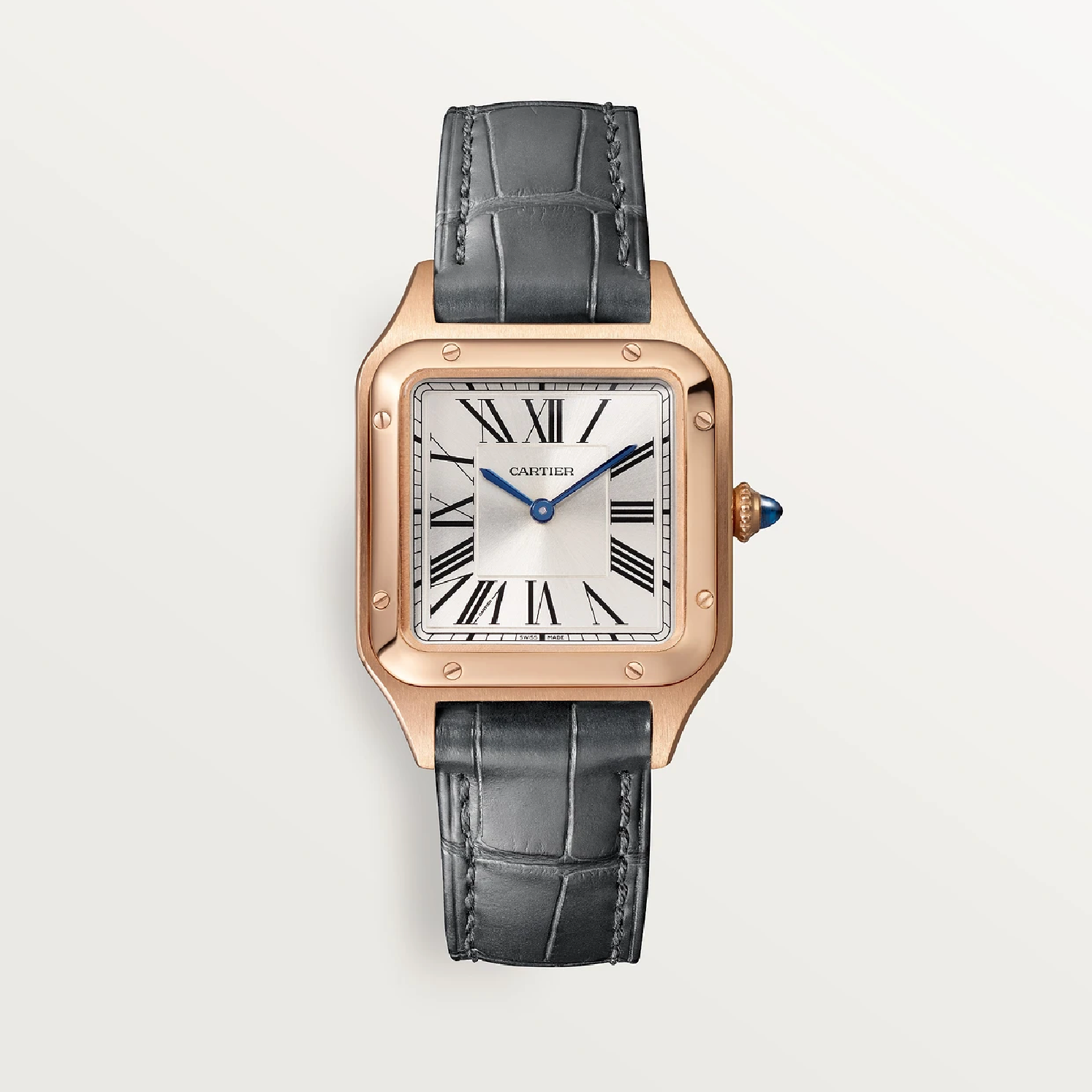| The Cartier Santos-Dumont small model exudes elegance with its rose gold case, high autonomy quartz movement, and timeless art deco aesthetic, perfect for refined collectors. | |