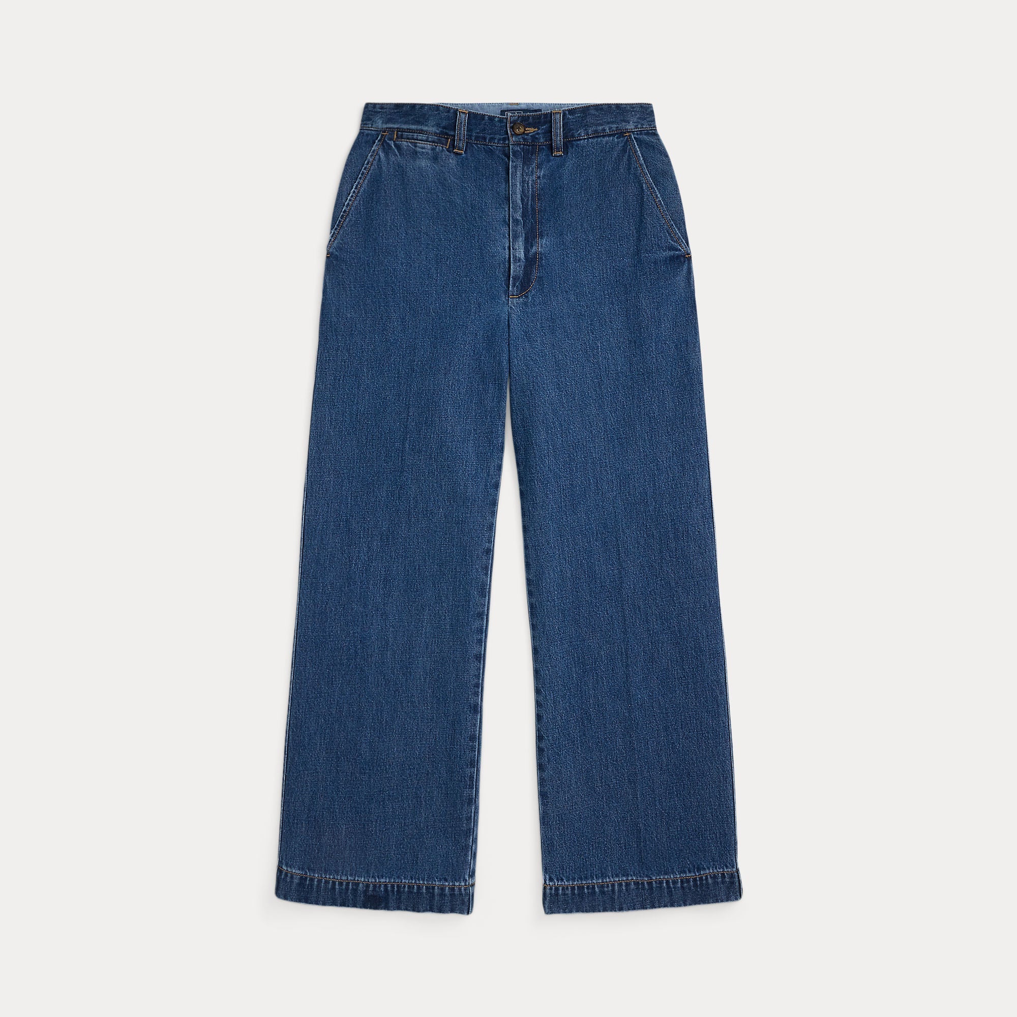 Crafted with Japanese right-hand twill, these lightweight jeans have a cropped, wide-leg silhouette and vintage-inspired slub character. Rope-dyed for a medium indigo wash, they are treated for a subtle high-low effect and feature creases at each leg.