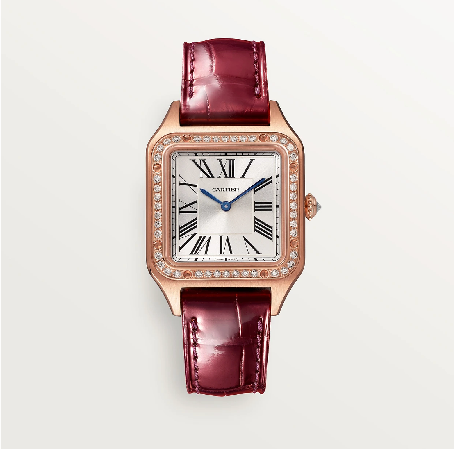 | This elegant Santos-Dumont by Cartier features a rose gold case, diamond-set bezel, brilliant-cut diamond crown, and vibrant alligator strap. Durable quartz movement ensures long autonomy. | |